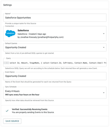Firstparty provides default options to retrieve new or updated Opportunities, and also allows you to write a custom Salesforce Object Query Language query to retrieve just about anything from your Salesforce instance. Firstparty will create an Event with the name you choose for each row of data Salesforce returns, and include all of the columns your query selects as Properties on that Event.