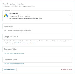 – A “Send Google Ads Conversion” Action where you’ll choose your Google Ads Connection and specify the Conversion Action to send to Google Ads